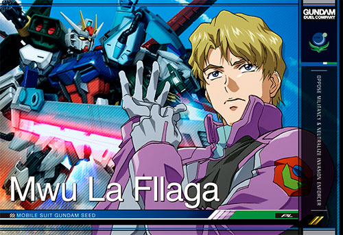 | 必要カード:ムウ・ラ・フラガ(第3弾)をGN-DC00 MS013 ストライクガンダムかエールストライクガンダム(GN-DC01 MS003、GN-DC02 MS010、GN-DC04 MS030)かGN-DC01 MS015 ソードストライクガンダムかGN-DC01D MS003 パーフェクトストライクガンダムかGN-DC01D MS011 ランチャーストライクガンダムかGN-DC02D MS002 ストライクガンダムI.W.S.P.に搭乗 |